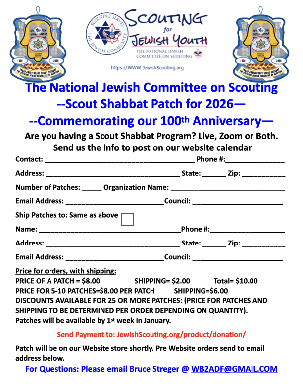 Also, there will be Scout Shabbat Services throughout the country in the January-March 2026 time frame. If there isn’t one near you, please contact me regarding on that you can join via Zoom. If you are having a Scout Shabbat, please let me know the details and we will post it on the website. The order form for 2026 Scout Shabbat patches is attached — it is a special patch honoring the 100th Anniversary of the National Jewish Committee on Scouting.